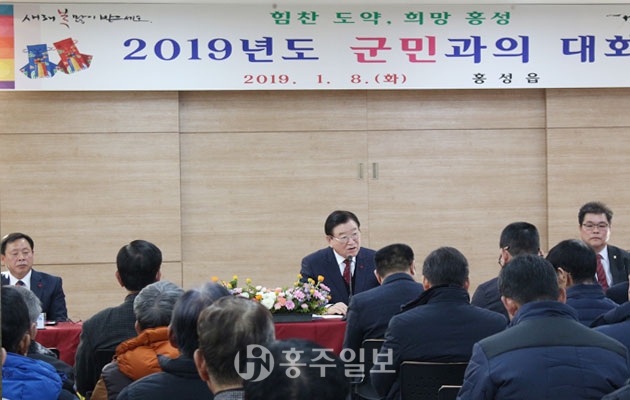 홍성읍에서는 군정홍보영상 방영과 김동표 홍성읍장, 김석환 군수, 김헌수 의장의 인사말에 이어 읍민과의 대화가 진행됐다. 홍성읍민과의 대화에서는 먼저 부영아파트 뒤편 부지와 관련해 자연녹지 지역을 주거지역으로 변환해 달라는 요청과 월계천 상류 폭포까지 화장실 설치 등 기반시설 정비를 요청했지만 김 군수는 모두 검토해 볼 내용이라고 답했다. 또 LH주공아파트 신축현장이 공사전 푹 파여진 상태로 있어 이에 대한 조치가 필요하다는 점에 대해 군수는 “내포지역 아파트도 비어있는데 LH가 홍성읍에 지어서 뭐하겠느냐”며 “군에서 수없이 접촉하고 노력은 하고 있지만 쉽지만은 않은 상황”이라고 말했다.