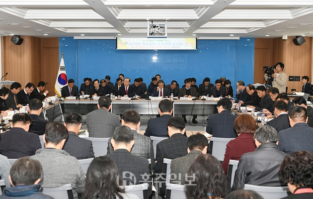 예산군이 지난 4일 대회의실에서 2019년 주요업무 추진계획 보고회를 개최하고 군정방향을 논의했다. 이번 보고회는 황선봉 군수를 비롯해 이상용 부군수, 국장, 각 부서장, 팀장 등 140여 명이 참석한 가운데 개최됐으며 부서별로 역점사업, 신규 및 기존(계속)사업, 민선 7기 공약 추진현황 등을 보고하고 군수 주재 토론 순으로 진행됐다.