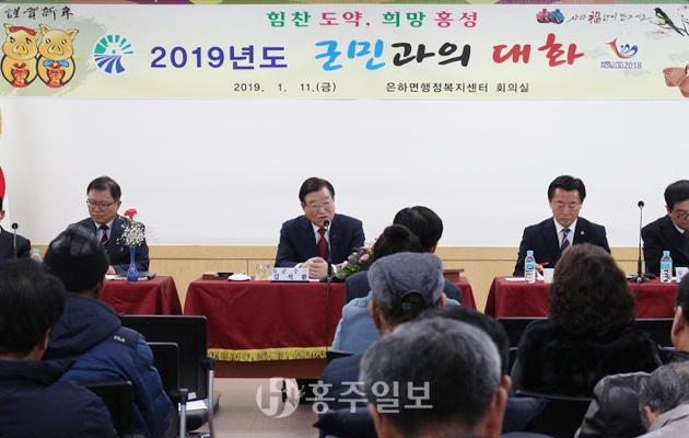 광천읍 순방에서는 옹암리지역 자연녹지 건폐율이 20%로 투자자가 건폐율 때문에 투자를 못하고 있는 부분이 지적됐으며, 장항선 철도시설 직선화에 대한 대책을 마련해줄 것을 요구하기도 했다. 이에 대해 김 군수는 “옹암리 건폐율 문제는 풀어줄 수 없다”고 답했고, 철도직선화 문제에 대해 “광천지역은 그동안 1·2·3안을 가지고 다퉈 왔는데 장항선 복선화 사업 예산을 반납한 상태라 광천읍민들의 의지가 중요하다”고 말했다.