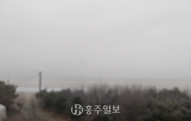 지난 14일 오전 8시 40분 홍북읍에서 내포신도시를 바라본 전경이 미세먼지로 인해 앞이 보이지 않는다. 충남도에 따르면 지난 14일 충남 전역에 고농도 미세먼지 비상저감조치’ 발령하고, 관련 조치를 시행 중이라고 밝혔다. 이번 비상저감조치 발령은 지난 11일 오후 8시 북부권역, 12일 오전 3시 서부권역, 12일 낮 12시 동남부권역 등에서 초미세먼지(PM2.5) 농도가 매우 나쁨 기준인 75㎍/㎥를 초과한 데 따른 것이다.