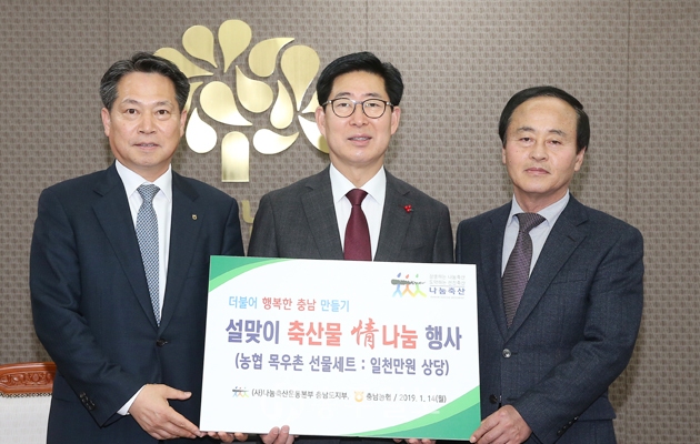 양승조 충남도지사는 지난 14일 도청 접견실에서 조소행 NH농협은행 충남지역본부장과 정문영 나눔축산운동본부 충남도지부장(천안축협조합장) 등으로부터 희망 떡국 떡 1000상자와 살코기 햄 200상자를 전달받았다.