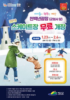 예산군은 겨울방학을 맞아 지난 23일부터 다음달 6일까지 15일간 군청사 앞 천백년 광장에 스케이트장을 개장하고 아이들이 마음껏 즐길 수 있는 무료 놀이공간을 제공할 계획이라고 밝혔다.<사진>