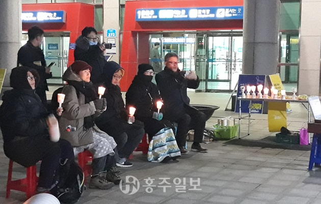 촛불문화제가 지난 17일 홍성역 광장에서 열렸다. 세월호 참사 이후 179번째, 홍성역 앞으로 자리를 옮겨 두 번째 열리는 집회다.<사진> 이날은 단원고 故 권순범 군의 어머니 최지영 씨와 故 오준영 군의 부모 오홍진, 임영애 씨가 함께 했다.
