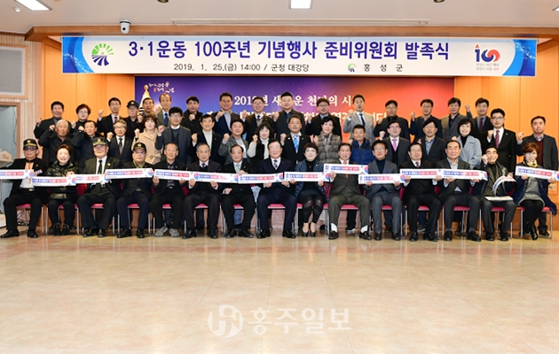 홍성군이 3·1운동 및 대한민국 임시정부 수립 100주년을 맞아 기념사업을 펼칠 계획이다. 이에 따라 지난 25일 군청 대강당에서 ‘3·1운동 100주년 기념행사 준비위원회 발족식’을 갖고 57명의 위원을 위촉하고 본격적인 행사 준비에 들어갔다.<사진>