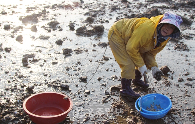옥희 할매는 아침부터 분주하다. 오늘은 11물이라 물이 늦은 시간에 빠지지만 조금을 제외하고는 새벽 5시면 하루를 시작한다. 조금 때가 쉬는 날이니 나갈 수 있을 때 부지런히 나간다. 애벌빨래를 해서 세탁기를 돌려 마당에 널고 밥솥에 쌀을 씻어 앉힌다. 그 사이 방 청소를 후딱 해치운다. 7시에 아침식사를 한다. 뻘에 나가는 날엔 아침을 든든하게 먹어야 한다. 2~3시까지 작업을 해야 하니 중간에 밥을 먹으러 다시 나오기가 어렵기 때문이다. 8시가 조금 넘어 뻘에 도착한다. 아직 물이 빠지려면 더 기다려야 하기에 엉덩이를 대고 돌팍에 앉는다.