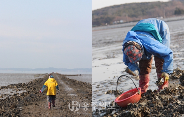 24살에 청양에서 시집 와 지금까지 물질을 하고 살았다. 살려면 어쩔 수 없다. 올해 일흔다섯 살이 됐으니 그 고생을 말해 뭣하겠는가. 그래도 놀면 심심하다. 굴을 캐면 대충 품이 어느 정도 나오는 걸 뻔히 아는데 손 놓고 있을 수는 없지 않은가 말이다. 자식들은 하지 말라고 하는데 쉬엄쉬엄 한다고 해도 하다보면 허리 아프고 무릎도 아프다. 갈산장이나 홍성장에 내다 팔면 품돈이 되어 고쟁이 속으로 들어오면 든든하니 그 맛으로 산다. 어느 새 물이 빠지기 시작한다. 옥희 할매는 장화를 신고 갯벌로 자박자박 걸어간다.