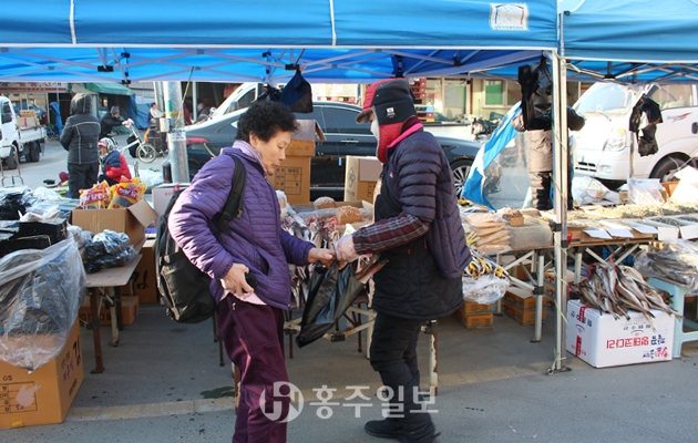 설 명절을 앞두고 홍성시장이 분주하다. 멀리서 오는 자식들 맛있는 것 하나라도 더 먹이고 싶어 하는 어머니들이 지갑을 부지런히 열고 닫는다. 가격도 흥정해보고, 덤을 달라고 애교도 부려본다. 상인들 역시 대목을 앞두고 덤도 주고 덕담도 나눈다.