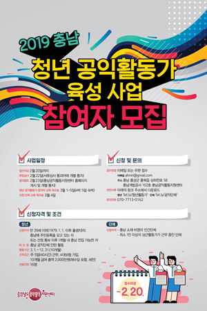 이번 사업은 청년들에게 공익 활동 경험과 기회를 제공하고 지역 공익단체에는 활동 인력을 지원하기 위해 기획됐다. 청년은 만 39세 이하, 충남도에 주민등록을 가지고 있어야 하며, 타 지역 거주시 1개월 내 충남으로 전입해야 한다.