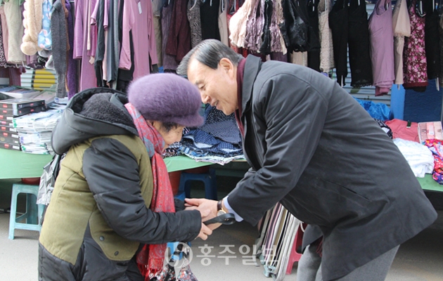 자유한국당 홍문표 국회의원도 지난달 31일 홍성전통시장을 방문 상인들과 악수를 나누며 새해 인사를 나눴다(가운데).