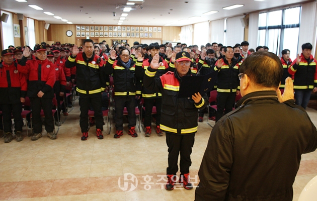 산불전문 진화대 및 감시원 발대식이 지난 11일 군청 대강당에서 전문 진화대 77명과 공무원 등 150여명이 참석한 가운데 개최됐다. 이날 선서식을 비롯해 김석환 군수의 인사말, 산불진화 및 감시에 대한 교육 등으로 진행됐다.