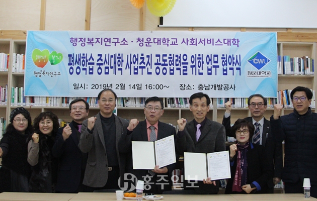 행복복지연구소(소장 송채규)가 청운대학교 사회서비스대학(학과장 조춘봉)과 지난 14일 평생학습 관련 교류와 협력 및 상호발전을 위한 업무협약을 체결했다.<사진>