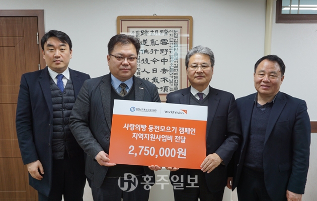 홍성교육지원청(교육장 우길동)은 지난 15일 월드비전 대전세종충남지역본부로부터 사랑의 빵 동전 모으기 캠페인 지역지원사업비 275만 원을 전달받았다. 월드비전은 ‘사랑의 빵 동전 모으기’에서 모금된 수익금을 지역 내 위기아동들을 위해 지원했다.