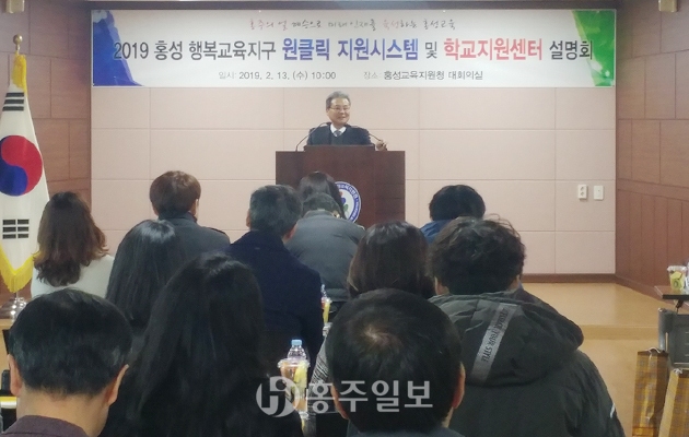 홍성교육지원청(교육장 우길동)은 지난 13일 대회의실에서 2019 홍성 행복교육지구 원클릭 지원시스템과 학교지원센터, 주요업무 설명회를 열었다.<사진>