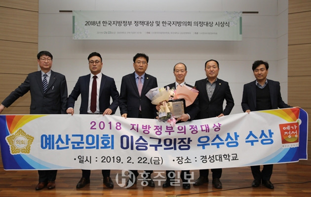 예산군의회 이승구 의장이 지난달 22일 부산 경성대학교에서 열린 ‘한국지방의회 의정대상’ 시상식에서 지역사회 발전과 군민 복지 증진에 대한 공로로 우수상을 수상했다.<사진>