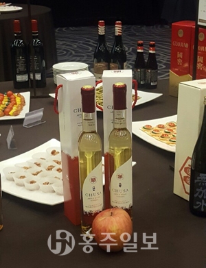 예산군 특산물인 사과를 이용해 사과와인과 블루베리 와인, 사과증류주를 생산하고 있는 농업회사법인 예산사과와인이 지난달 28일 웨스턴조선호텔에서 열린 ‘2019년 대한민국 주류대상’에서 한국와인분야와 증류주 분야에 출품한 ‘추사애플와인’<사진>, ‘추사블루베리와인’, ‘증류주 추사 40’ 3종류 모두 대상을 차지했다. 특히 사과와인 ‘추사애플와인’은 농림축산식품부에서 개최하는 대한민국 우리 술 품평회에서 2013년, 2015년 대상을 받은데 이어 이번 수상으로 최고의 와인으로 인정받았다.