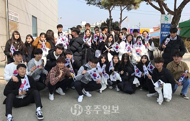 홍성군청소년자원봉사단 청로회(회장 이철이) 학생들이 홍성군청소년수련관 학생들과 홍성군어린이집연합회와 함께 3·1운동 100주년을 맞아 ‘독도는 우리 땅, 독립군가’라는 곡으로 플래시몹에 참여했다.<사진>