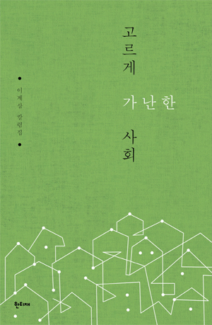 ‘고르게 가난한 사회’는 밀양송전탑반대대책위 사무국장 이계삼 씨의 칼럼집이다. 도시로 보내는 전기를 위해 발전소가 세워지고 그 사이를 잇는 고압의 송전탑이 세워졌다. 장거리 송전의 효율을 위해 초고압으로 전기를 보낸다. 형광등이 켜질 정도의 고압인 송전탑의 전자파는 대단하다. 송전탑으로 마을은 찬성과 반대로 갈라졌다. 갈등이 깊어지며 죽는 이도 있었다.