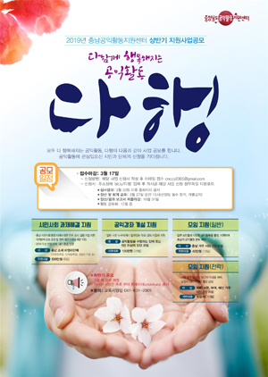 충남공익활동지원센터(센터장 이지훈)가 오는 17일까지 도민과 시민사회의 자발적인 공익활동을 지원하는 ‘다행’ 사업을 공모한다.<사진>