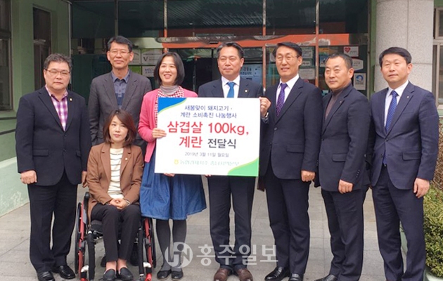 농협 충남지역본부(본부장 조소행)는 돼지고기와 계란 소비 촉진의 일환으로 홍성군장애인종합복지관(관장 복천규)에 삼겹살 100kg과 계란 120판을 전달했다. 조 본부장은 “앞으로도 지역사회와 소통하며 함께 갈 수 있는 기회를 계속 마련하겠다”고 말했다.