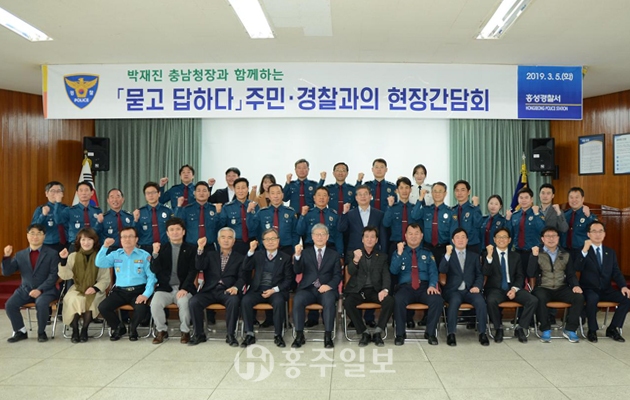 박재진 충남지방경찰청장이 지난 5일 홍성경찰서를 방문해 직원들의 노고를 격려하고 다양한 의견 청취를 들었다. 박 청장은 이날 각 주민 참석자와 함께 현장간담회를 갖고 지역맞춤형 치안시책과 사회적 약자 보호 실현 등을 위한 다양한 의견을 나눴다.