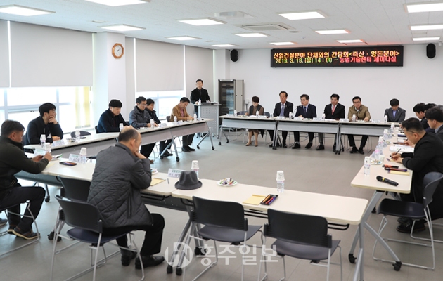 홍성군의회 산업건설위원회(위원장 이선균)가 지난 18일 홍성군농업기술센터에서 대한한돈협회 홍성군지부 관계자들이 참석한 가운데 양돈 관련 간담회를 실시했다.<사진> 이번 간담회에서는 양돈 분뇨를 활용한 바이오가스 사업 필요, 악취 저감 및 미관개선을 위한 측백나무 식재, 축산농가 고령화에 따른 대책 마련 등이 논의됐다.