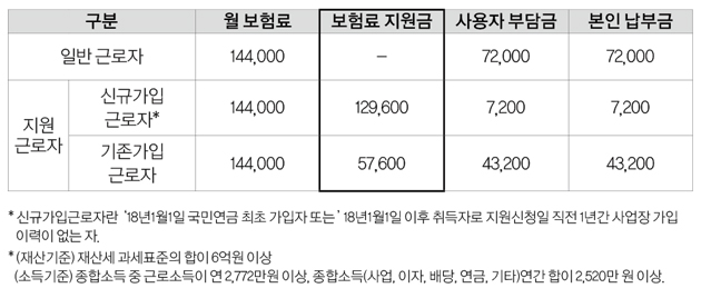 지원대상은 국민연금 사업장가입자 중 사용자를 제외한 근로자(법인 대표이사 제외)가 10명 미만인 사업장에 근무하는 기준소득월액이 210만 원 미만인 근로자입니다. 지원 수준은 신규가입자의 경우 연금 보험료의 최대 90%이며 기존가입자는 40%입니다.