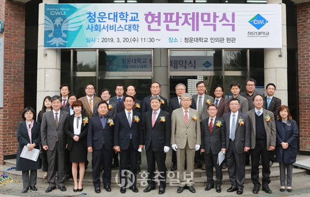 청운대학교(총장 이우종)는 지난달 20일 청운대학교 인의관에서 사회서비스대학(학장 조춘봉) 현판 제막식을 개최했다.<사진>