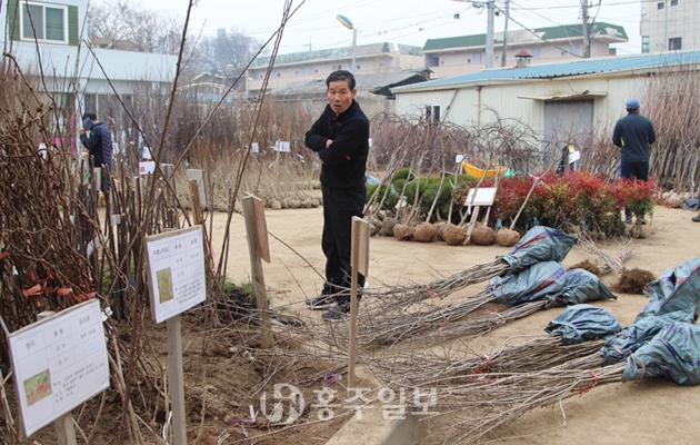 봄을 맞아 어떤 나무를 심을지 고심하며 둘러보는 한 주민의 얼굴 표정이 사뭇 진지해 보인다. 홍성군산림조합에서 개장한 나무시장에서 주민들이 나무를 고르고 있다. 다음달 10일까지 운영되는 나무시장에는 산림용, 유실수, 조경수, 특용수 등과 임업용 자재 등이 판매된다.