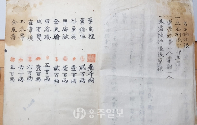 명단에 따르면 이우직 1000량, 황일성 200량, 박규영 100량, 신해철 200량, 김동한 200량, 전용옥 500량, 성유경 100량, 최장환 600량, 박영수 60량, 김동수 500량, 심성기 100량, 이경헌 100량, 김창현 300량, 전용학 70량, 이영규 100량, 이학구 30량, 최명용 300량, 김동설 100량, 이종규 50량, 이규언 100량, 홍일섭 50량, 박봉래 50량, 김응환 200량, 구경회 100량, 구돈회 150량, 권용현 50량, 이규상 100량, 방효직 50량, 서익모 50량, 방효석 30량, 이희창 50량, 황예성 50량, 황시현 50량, 이승갑 30량, 한상조 30량, 배중환 50량, 한근영 50량, 이길성 20량, 이한영 40량, 김용구 30량, 박노준 100량, 황병국 50량, 황재일 50량, 명우진 20량, 김원직 50량, 이일형 60량 등이다.