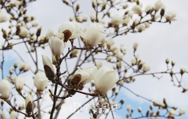 봄을 시샘하는 꽃샘추위가 지속되는 가운데 홍성읍 소향리에 하얀 목련이 꽃망울을 터트렸다. 고귀함을 뜻하는 하얀 목련이 피어날 때면 목련꽃의 화려함 뒤에 숨어 있는 낙화의 슬픔이 깊어가는 봄날의 아련함을 느끼게 한다.