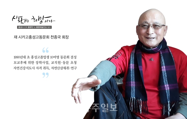 이렇듯 고향을 그리워 찾는 사람이 있다. 미국 이민생활 40여년을 넘긴 천종국(71) 재 시카코홍성고동문회장이 고향인 홍성을 찾는 이유도 그렇다. 홍성읍 오관리에서 태어나고 자란 천종국 회장은 홍주초, 홍성중, 홍성고(22회)를 졸업했다. 천 회장은 지난 1976년 미국 시카고로 이민을 떠났다. 그곳에서 미용재료상, 야외 골프연습장, 부동산 투자사업 등을 하면서 자리를 잡았다. 이후 사업과 생활이 안정되면서 해마다 고향인 홍성을 찾아와 한 달 여씩 머물다 가기를 30여 년째 실행하고 있다. 올해에도 천 회장은 지난달 홍성을 방문해 오는 10일까지 홍성온천에서 머물다 미국으로 다시 돌아갈 예정이다. 고향의 친구들과 선후배들을 만나고 또 다시 만남을 기약하며 돌아가는데, 천 회장의 고향과 모교사랑정신의 실천은 이미 홍성고 졸업생들과 홍성사회의 지인들에게는 널리 알려진 사연이다. 천 회장은 1990년대 초 시카고에 살고 있는 홍성고 졸업생 10여명을 찾아내 동문회를 결성했다. 그리고는 모교사랑운동과 모교 후배들 돕기 운동을 주도했다. 처음으로 모교 후배들을 위한 장학사업을 시작한 시카고홍성고동문회는 홍성고 출신으로 모교에 재직 중인 교직원 1명과 총동창회 일을 열심히 하는 동문 1명을 초청, 미국의 고등교육을 참관하고 관광을 주선하는 등의 지원을 해왔다. 재 시카고홍성고동문회의 모교 돕기 활동은 20년 전 쯤으로 거슬러 올라간다. 지금은 재 로스앤젤레스홍성고동문회로 이어져 모교사랑운동을 계속해 펼치고 있다. 재 로스앤젤레스홍성고동문회는 해마다 모교인 홍성고에 입학한 우수 합격자 3명씩을 초청해 어학연수 프로그램 등을 현재까지 계속해 이어오고 있다. 홍성고 재학시절 태권도를 한 천종국 회장은 지금까지도 만능 스포츠맨으로 통하고 있다. 천 회장은 미국에서도 운동을 계속했는데, 특히 볼링과 골프는 시카고 교포 중에서 단연 선두권이라고 전한다.