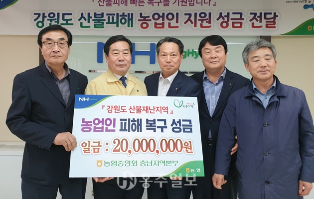 농협 충남지역본부(본부장 조소행)는 지난 4일 강원지역에서 발생한 대형 산불로 피해를 입은 강원도민을 돕기 위해 재난복구 임직원 성금 2000만 원을 농협 강원지역본부에 전달했다.<사진>
