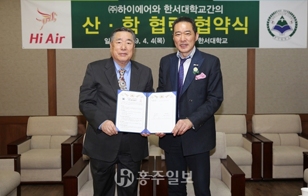 한서대(총장 함기선)와 ㈜하이에어는 지난 4일 항공운송산업의 발전을 위해 함께 노력하기로 합의하고 7개 항목의 산학협력협약을 체결했다.<사진>