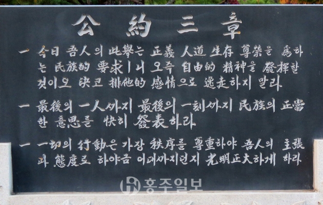 만해 생가지에서 눈에 띄는 것은 3·1독립선언 당시 만해가 직접 작성했다는 ‘공약삼장비(公約三章碑)’이다. 이 ‘공약삼장비문’은 전국에서 유일하게 만해의 생가지에만 세워져 있다고 한다. 2001년 당시 이상선 전 홍성군수에 의해 제작돼 세워졌는데, 만해의 기백과 정신이 공약삼장에 그대로 배어 있다는 평가다. 만해 생가지에 공약삼장비문을 제작해 세운 이상선 전 홍성군수는 “1991년 당시 이병칠 전 군의회 의장 등 군의원, 신보규 기획실장 등 공무원들과 함께 청산리전적지를 처음으로 방문했다”며 “당시 홍성 고암리 출신의 박계동 연길시장 등을 만나 청산리전적지 첫 방문을 마치고 서울 프레스센터에서 방문보고회를 가졌다”고 회고하고, 이러한 일련의 과정에서 만해 선사의 공양삼장비를 꼭 제작해 세우겠다는 결심을 하고 돌아와 2001년 8월 광복절에 생가지에 공약삼장비문을 세웠다”고 밝혔다. 이 전 군수는 “전국에서 유일하게 세운 공약삼장비 일 것”이라며 “정의와 자유, 민족과 철저한 불교의 실천행을 강조한 만해 선사의 정신과 삶의 철학이 그대로 배여 있는 비문”이라고 말했다.