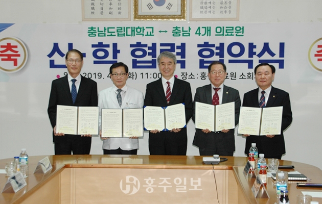 홍성의료원, 천안의료원, 공주의료원, 서산의료원 등 4개 병원과 충남도립대학교가 지난 9일 홍성의료원 회의실에서 관계자들이 참석한 가운데 상호 협력체계 구축을 위한 산·학 교류협력 협약을 체결했다.<사진>