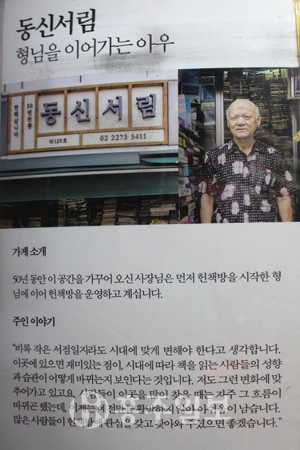 ‘동신서림, 형님을 이어가는 아우’란 글귀와 함께 ‘50년 동안 가꾸어 오신 사장님은 먼저 헌책방을 시작하신 형님에 이어 헌책방을 운영하고 계십니다’란 가게소개와 책방 주인의 이야기가 다음과 같이 기록돼 있는 글귀가 책방 입구에 붙어 있는 것이 눈에 띄었다. “비록 작은 서점일지라도 시대에 맞게 변해야 한다고 생각합니다. 이 곳에 있으면 재미있는 점이 시대에 따라 책을 읽는 사람들의 성향과 습관이 어떻게 변하는지 보인다는 것입니다. 저도 그런 변화에 맞추어 가고 있고요. 사람들이 이곳을 자주 찾을 때는 자주 그 흐름이 바뀌곤 했는데, 이제는 예전만큼 활발하지 않아 아쉬움이 남습니다. 많은 사람들이 헌책방에 관심을 갖고 찾아와 주셨으면 감사하겠습니다.”