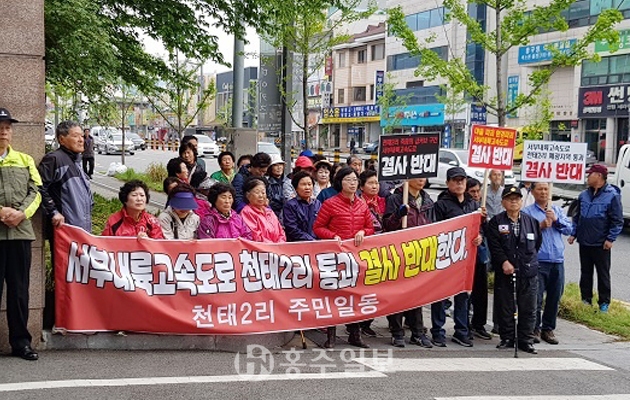 평택-부여-익산을 잇는 서부내륙고속도로 노선 주변의 민원이 끊이질 않고 있다. 천태산 탄광 갱도 지역에 살고 있는 충남 홍성군 천태리 주민들은 지난 29일 대전지방국토관리청을 항의 방문했다.