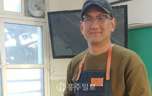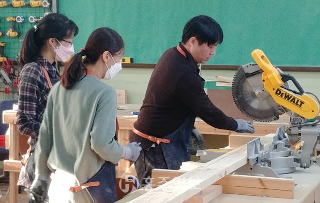 “도기웅 선생님께서 낸 기획안이 충남도교육청 공모사업에 선정되면서 지난해 목공동아리를 만들게 됐다. 목공에 관심을 가진 학부모들끼리 동아리를 구성하여 나무를 재단하고 조립하여 학교 소품은 물론 개인 소품 등 가구 만들기를 하고 있으며, 보통 일주일에 한 번 수요일 오후 3시부터 9시까지 운영된다. 사실 홍주초의 목공교실은 오현숙 교장 선생님의 의지와 도기웅 선생님의 도전정신, 학부모들의 관심이 더해져 이뤄낸 성과이다”