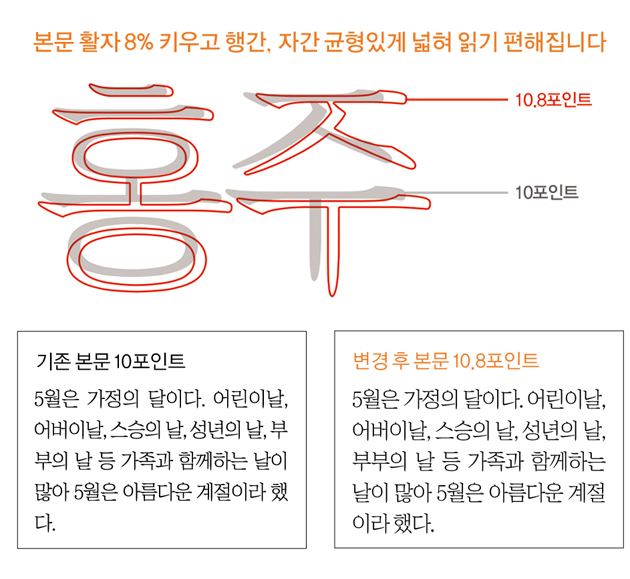 홍주신문 모든 지면의 본문 활자가 기존 10포인트에서 10.8포인트로 약 8%가량 확대됩니다. 본문 글자의 크기와 자간, 행간을 적절하게 조정해 독자들이 더 쉽고 편안하게 읽을 수 있도록 가독성을 향상시켰습니다.