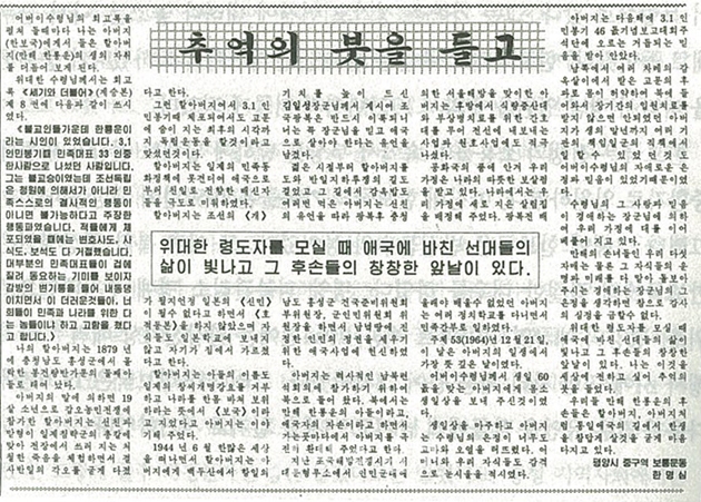 또한 아버지 한보국에 대해서는 “남쪽에서 여러 차례의 감옥살이에서 받은 고문의 후과로 몸이 허약해 북에 들어와서 장기간의 입원치료를 받지 않으면 안 되었던 아버지가 생의 말년까지 여러 기관의 책임 일꾼의 직책에서 일할 수 있었던 것은 정과 믿음이 있었기 때문이었다”고 적고 있다.