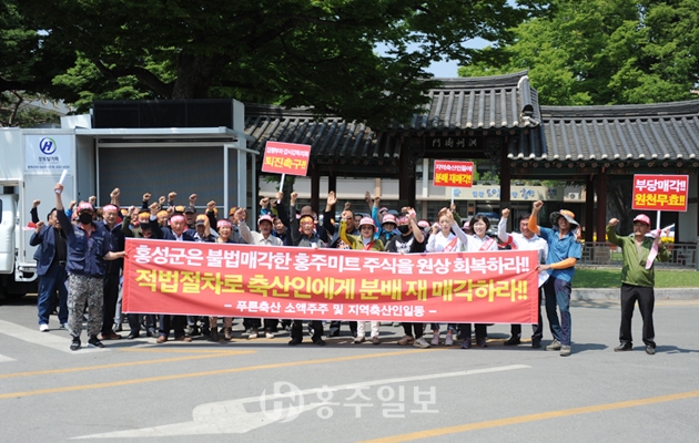 한편, 이날 모인 영농조합법인푸른축산 조합원들 및 지역축산인들은 홍성군이 공유재산법 등 법규를 무시하고 특정인에게 (주)홍주미트 주식을 매각한 것이므로 무효화해 원상회복시키고, 법적절차에 따라 지역축산인들에게 재매각 해야한다는 입장이다.