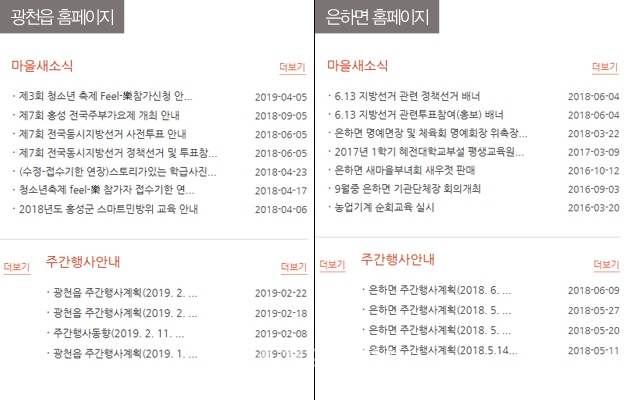 지난 15일 현재 광천읍 홈페이지의 주간행사안내 란에는 2019년 2월 25일~3월 3일치가 게재돼 있다. 또 은하면 홈페이지의 경우는 지난 2018년 6월 11일~18일까지의 주간행사 안내가 그대로 게재돼 있을 뿐이다. 갈산면의 경우는 2019년 4월 29일치가 게재돼 있어 읍면 홍보는 물론 주민서비스에 대한 허점을 노출하고 있다는 지적이다.