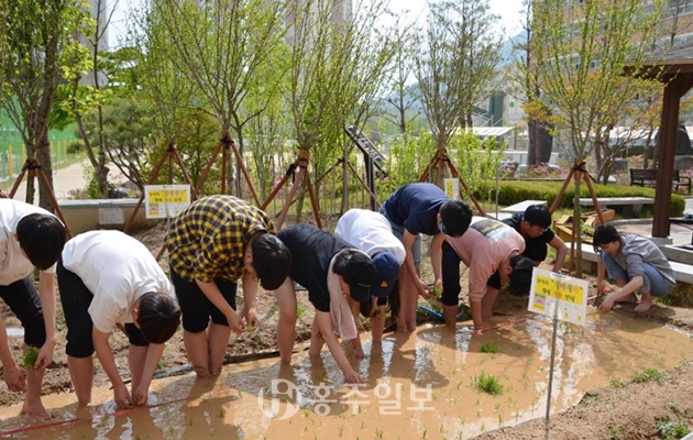 홍성고등학교(교장 이승우)는 ‘재배재배 동아리’ 회원 10여 명과 함께 교내 조성된 무논에 모내기를 실시했다. 학생들은 직접 맨발로 무논에 들어가 줄잡이들의 안내에 따라 모내기를 했다.