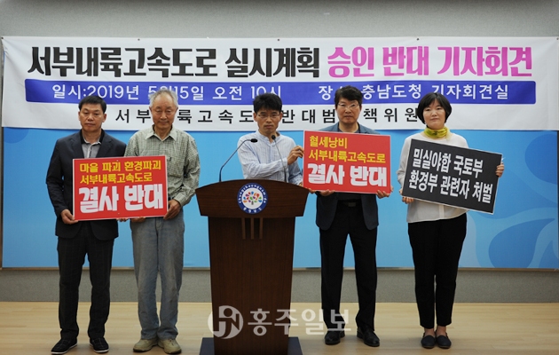 서부내륙고속도로가 건설되면 직접 피해를 입게될 홍성군 천태2리 주민들과 예산 주민들로 구성된 서부내륙고속도로범대책위(아래 범대책위)는 지난 15일 충남도청 프레스센터에서 기자회견을 열고 “국토부는 국민 혈세 낭비하는 서부내륙고속도로 실시계약을 승인해선 안 된다”고 주장했다.<사진>