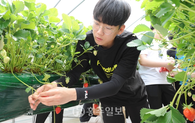“와! 진짜 맛있다”, “아냐, 이게 더 맛있어”라며 전북 익산에서 온 제일고등학교 학생들이 딸기밭 여기저기서 탄성을 질러댔다. 지난 10일 찾은 ‘온누리 딸기농장(대표 이종광)’은 딸기따기 체험 중인 학생들로 한바탕 즐거운 자리가 연출됐다.