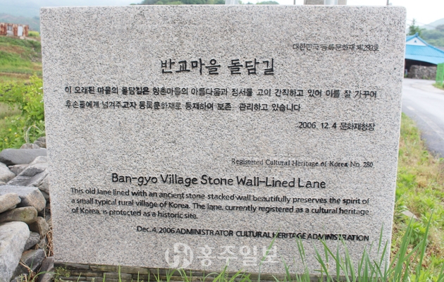 이쪽은 파란지붕, 저쪽은 반교3교, 저기는 마늘밭…. 돌담과 함께 각인된 곳곳의 풍경이 돌담길을 따라 교차되면서 마을의 모습이 쉽게 그려진다. 물론 녹음이 자꾸 짙어지는 계절이니 만큼 마을 전체를 한 눈에 넣기는 무리다. 돌담길 사이로 관광객들의 모습이 보인다. 마을 주민들은 빈말이라도 ‘돌담 무얼 볼게 있다구…’라고 혼잣말처럼 말끝을 흐린다. 하지만 마을 주민들의 모습이 어찌나 정겨운지 모른다. 돌담길을 걷다보니 그 정겨웠던 모습이 어느 순간 회상되고 있었다. 사라져가는 마을의 좁은 고샅길과 옛 정취가 물씬 풍기는 구불구불한 돌담길이 어느 새 세월의 간극을 뛰어 넘어 관광상품으로 개발돼 관광상품으로 뜨는 시대에 살고 있다.