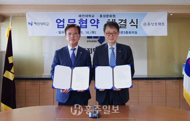 홍성문화원(원장 유환동)과 혜전대학교(총장 이세진)는 지난 15일 혜전대학교 본관 3층 회의실에서 업무협약식을 가졌다.<사진>