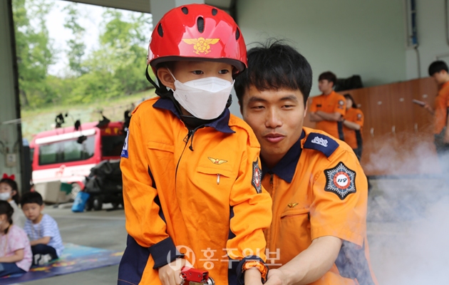 홍성소방서(서장 송원규)는 지난 16일 가람유치원 어린이, 지도교사 80명을 대상으로 △소방서에서 하는 일 △화재 시 대피요령 △119 신고요령 △연습용 연기소화기 체험 등 소방안전교육을 실시했다.