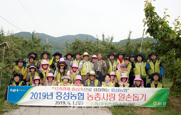 홍성농협(조합장 정해명)은 지난 1일 농번기를 맞아 40명의 임직원들이 함께 홍성읍 월산리 소재 형제농원(대표 정장로)을 찾아 사과나무 적과작업 등 농촌 일손 돕기를 펼치며 구슬땀을 흘렸다.