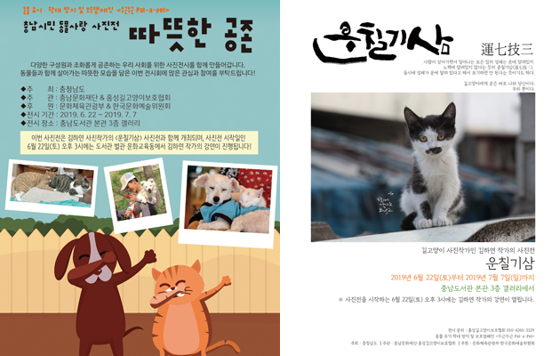‘따뜻한 공존’ 사진전은 충남도 내에 거주하는 시민 또는 충남도의 유기동물을 입양한 이들이 제출한 다양한 사진을 전시하는 행사다. 함께 열리는 ‘운칠기삼’ 사진전은 길고양이 전문 사진작가인 김하연 작가의 사진들을 전시하는 행사로 같은 장소와 시간에 열린다. 특히 사진전 시작일인 오는 22일 오후 3시에는 김하연 작가가 ‘길에서 태어났지만 우리의 이웃’을 주제로 특별강의를 펼칠 예정이다.